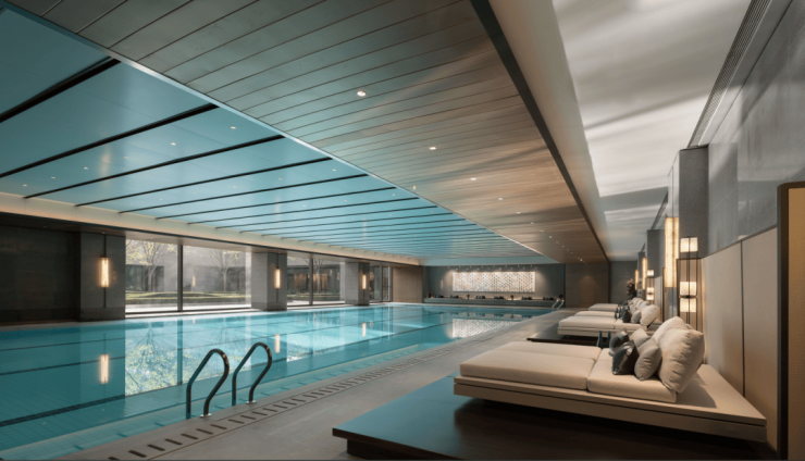 内部有25*11m半标恒温泳池、约180㎡私宴厅、酒窖、会客厅及健身房等功能。