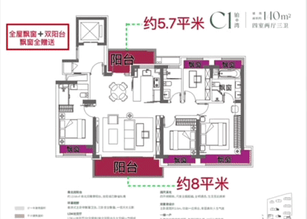 ⑤户型升级:无连廊+南北通透+双阳台+全屋飘窗+270°转角飘窗,附加空间+实得率秒杀全场,居住舒适度全面提升!