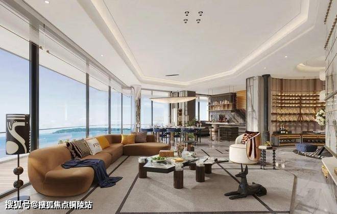 这已超越传统客厅的概念,它是一个融合了观景、聚会、休闲功能的“全景社交平台”,室内的通透感与空间张力让人惊叹。