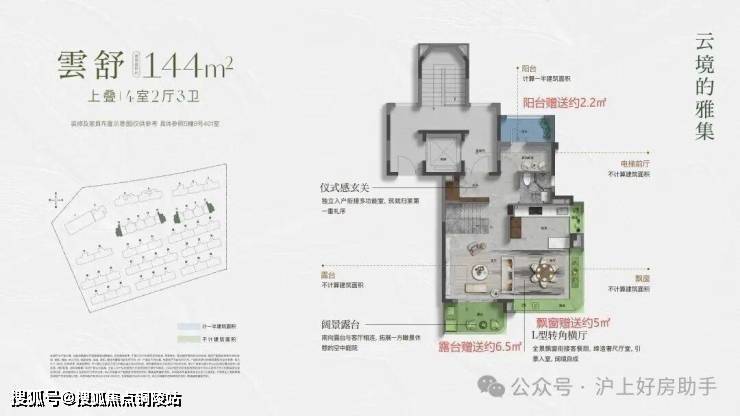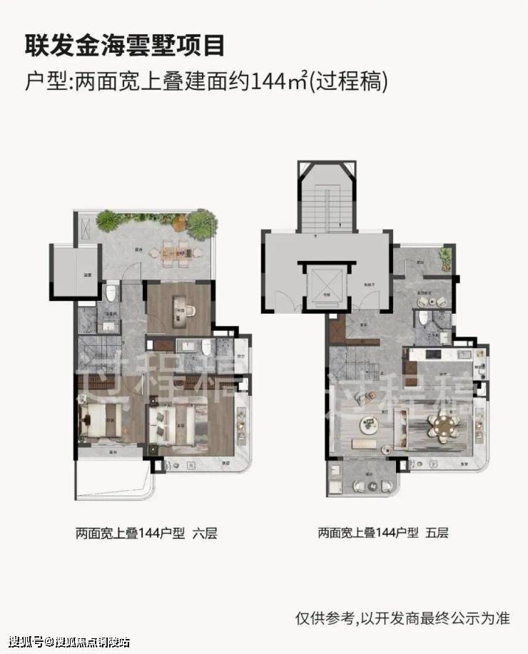 建面约144㎡的上叠产品,通过巧妙的挑空、总计约15㎡露台及灵动空间设计,让户型的 实际可使用面积高达约180 ㎡,实得率约125%。