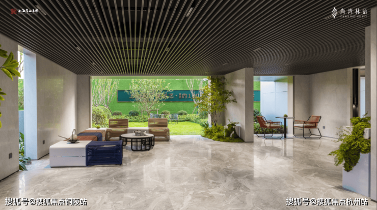 进入内部是灰色大面铝板搭配金色格栅,电梯厅墙面则铺设大面积岩板,吊顶也颇具设计感。