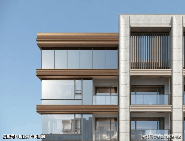 项目可视面都是古铜色金属铝板、米黄色铝板/石材、边套270°大转角飘窗,且从正面、侧面到背面,立面都保持精致统一。