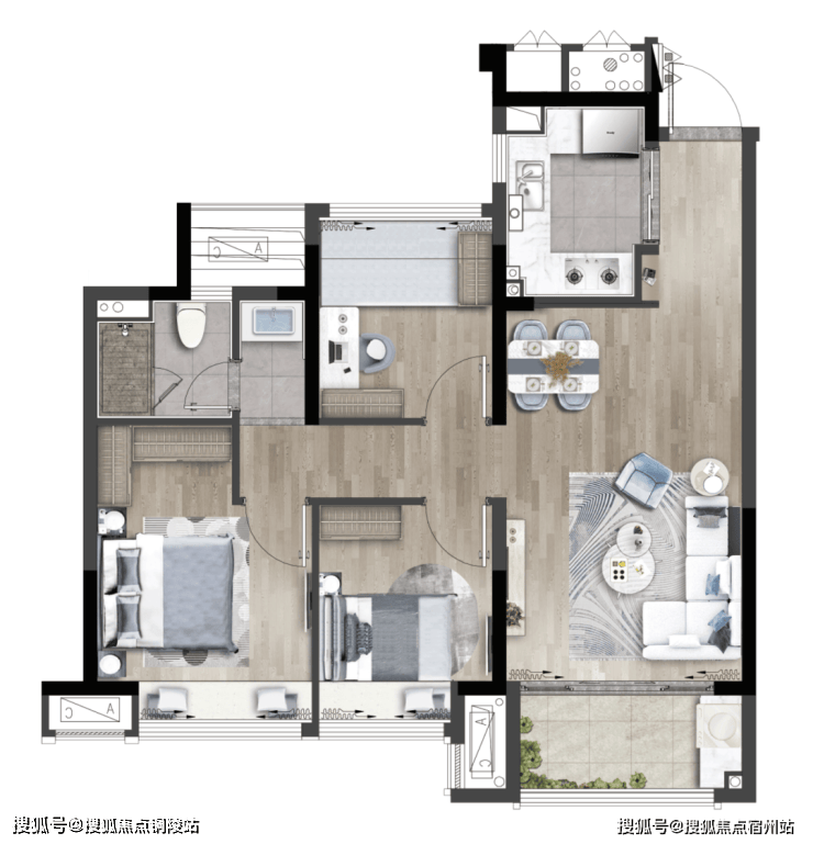 该户型各功能间尺度更舒适也更均衡,是一个能让三口之家真正一步到位的户型;