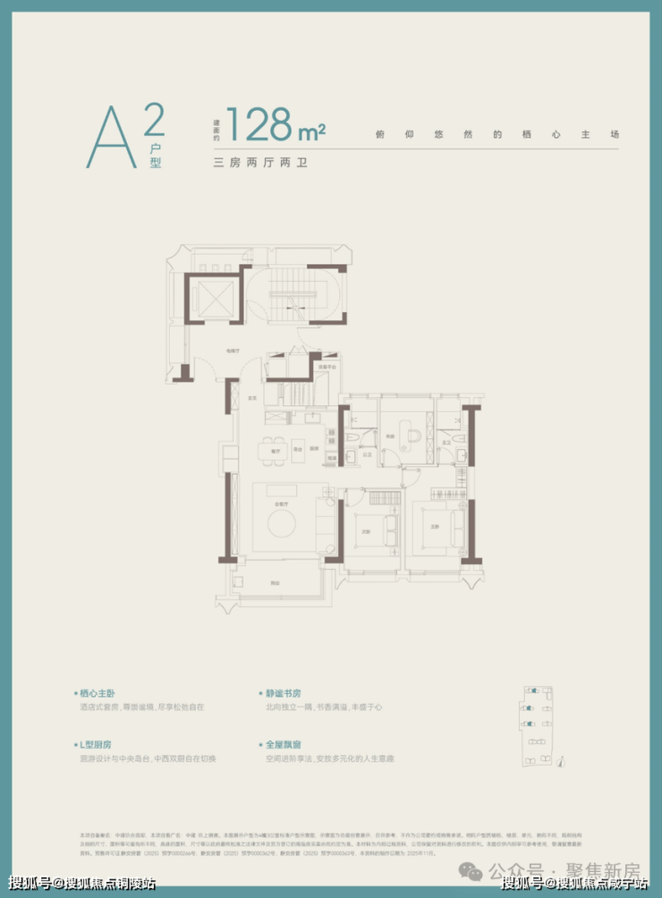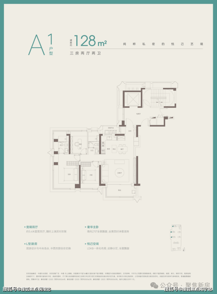 建面约128㎡的户型来看:整个户型拥有约270°的超级采光面,客厅有宽面阳台、双次卧+次卫有飘窗、主卧有约270°的无柱转角飘窗+双飘窗的主卫,整个空间采光通透度相当出众。最重要的是,这6飘窗+1个约270°的无柱飘窗全是赠送空间!