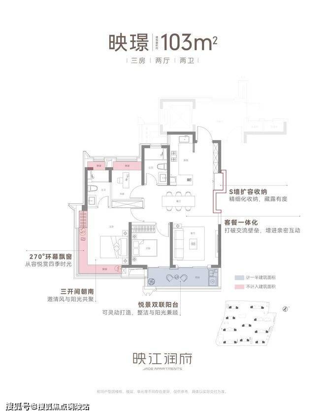 建筑面积约103㎡三房两厅两卫,不失为改善家庭的首选。其中边套户型,映江润府售楼处电话:400-9699-334✨【官方认证】✅✅✅的主卧套房做了 270°环幕飘窗,实现无与伦比的采光通风和视野享受,类比于千万级豪宅的体验!