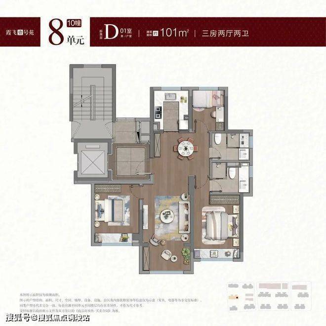 建面约100-101㎡户型,拥类独立电梯厅,无连廊+飞机户型南北通透。