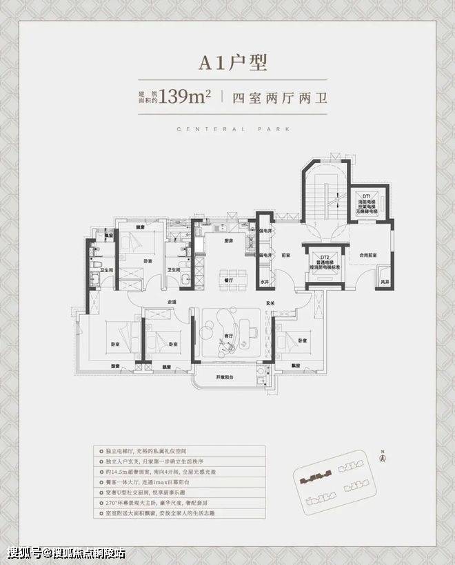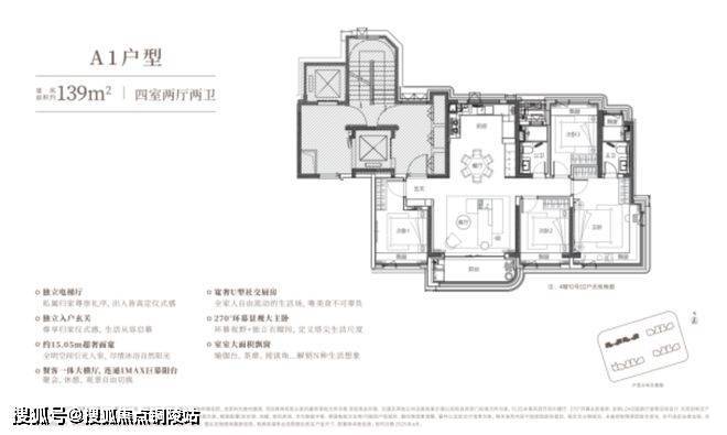 4#楼户型为建面约139㎡四房,拥有“个性大四房+15.05米IMAX大面宽+一梯一户(边套)+270°转角飘窗”构建纯粹改善设计。