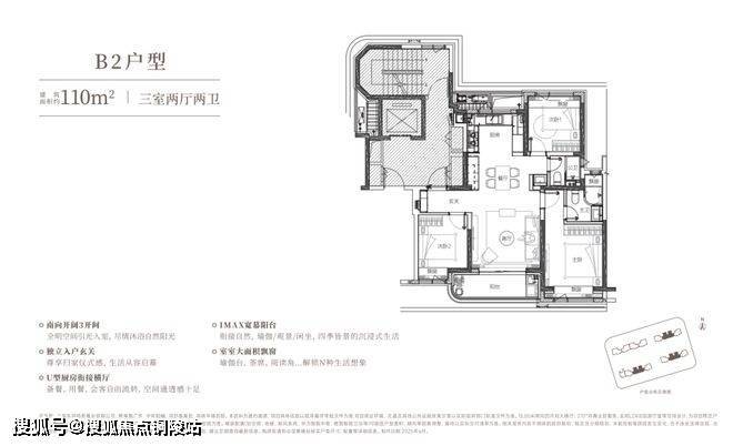 建面约110㎡中间套(B2户型),也同样做到了南北通透,三开间朝南,洄游动线,布局合理,无论是空间尺度还是通风采光,与边套享受一样的品质感!