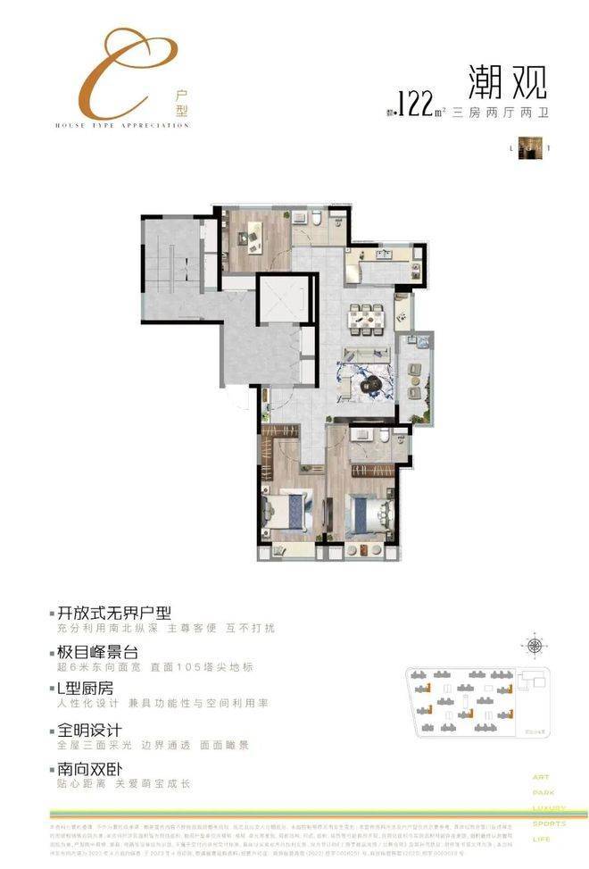 上实望海售楼处电话:400-8855-420✨【官方认证】✅✅✅120㎡户型为3房2卫,四开间朝南+横向的客餐厅带超大阳台的设计,让户型得房率出色,尺度感惊艳,适合改善型家庭。122㎡的边套户型拥有超6米的东向面宽,采光出色,且直面105塔尖地标,景观优势明显。
