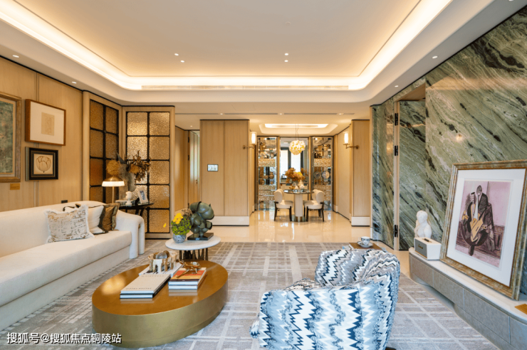 例如入户玄关铺设有“石材皇后”鱼肚印象,这种级别的奢石在很多顶豪项目中通常仅作局部镶嵌