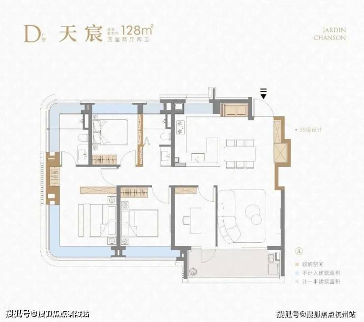 项目建面约128㎡4房户型延续了前作3S墙的设计,保证了收纳空间的丰富性。
