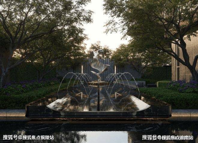 前场花园以兰特庄园为设计灵感,明确的中央轴线贯穿,中心喷泉顶端放置了应晶晶的山海金阙,以秩序中的自然理念通过几何布局、水景艺术和人文符号加功能美学与哲学融为一体。