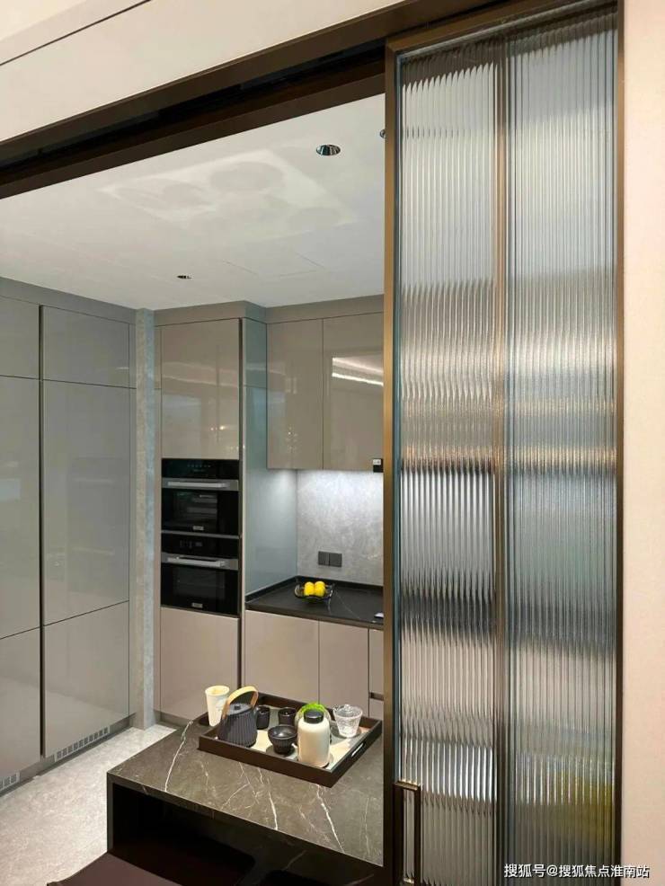 厨房玻璃门是 上轨道移门 ,意味着地面部分没有任何轨道,不会有灰尘积攒,炒菜时关上,避免油烟散入室内;平时拉开,可以扩充室内视觉感受。