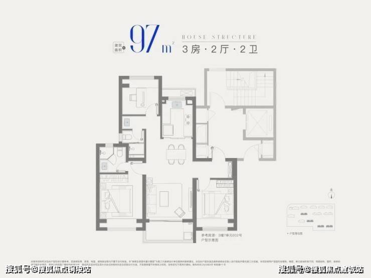 建面约97㎡3房2卫,升级版大3房,入户玄关+主卧套房设计,整体私密性更强,空间更为宽敞。