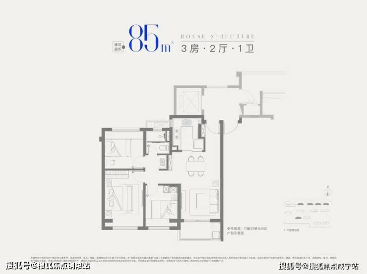 建面约85㎡3房1卫,做到三开间朝南+全卧室带飘窗+卫生间干湿分离+动静分离,非常紧凑的小3房。