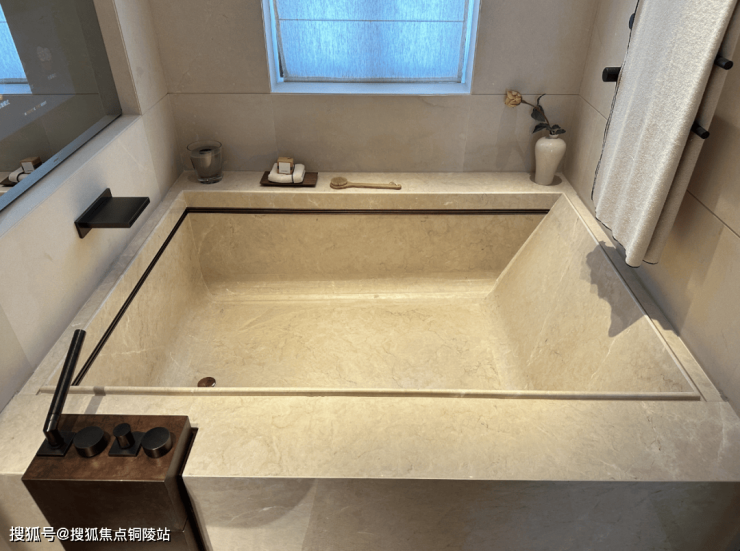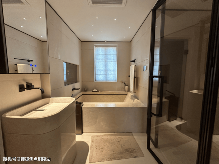 而样板间里这第二个卫浴空间,更接近于享受级。嵌入式浴缸,设计了魔镜系统,可以供业主泡澡时观影娱乐;除此之外,这个卫生间也有独立的淋浴房,并设计有桑拿房。