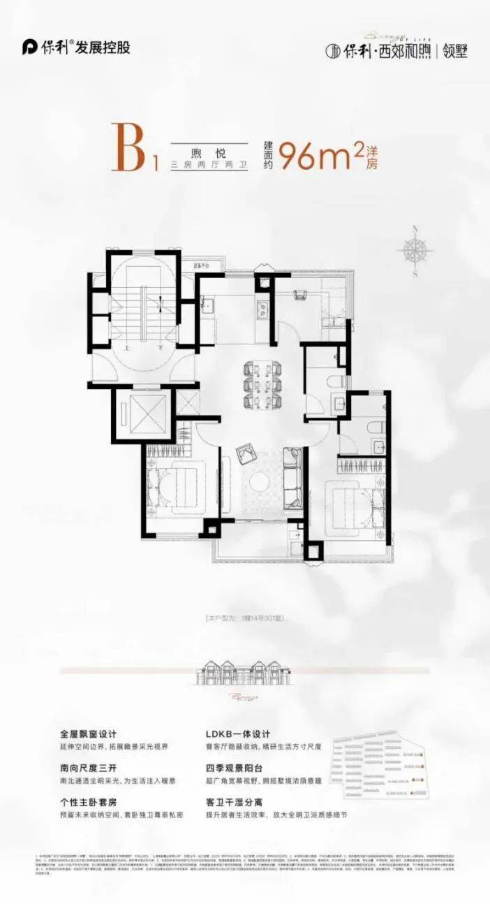 建面约 96㎡的 洋房户型,以三房两卫的全能格局。LDKB 一体化设计,打破空间边界,让餐客厅与阳台流畅相连,成为家庭互动、宴请宾客的活力场域 。全屋飘窗延展空间,引阳光与风景入室,三开间朝南、南北通透。