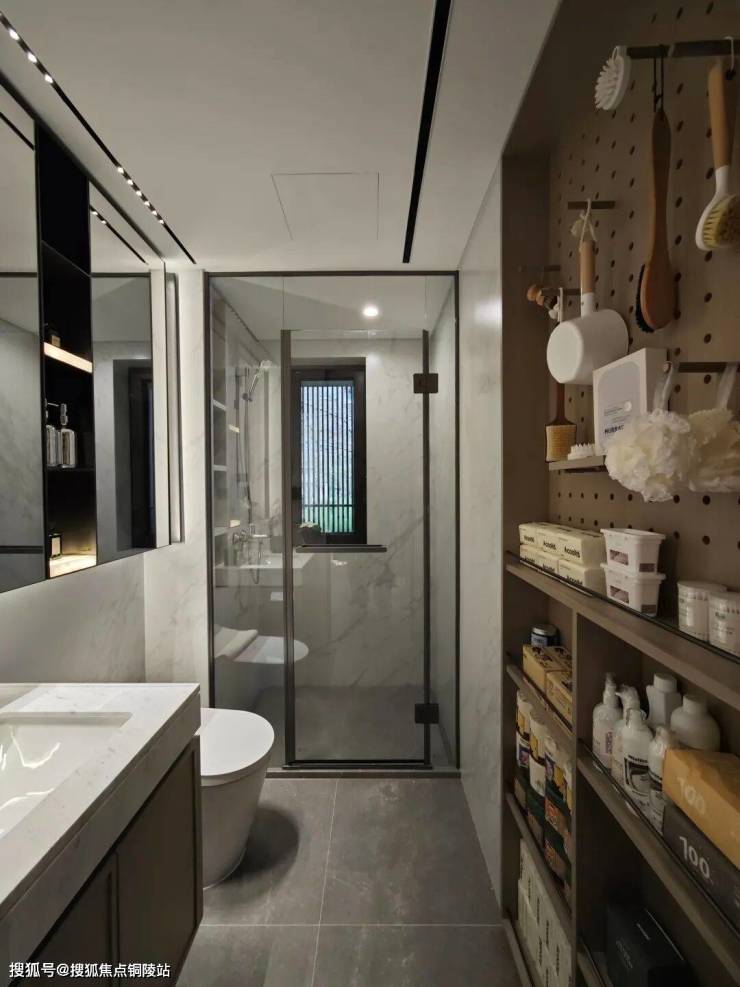 另外,在卫生间部分,项目在台盆对面做了一个墙体的向后延伸,再次做出一个超大尺寸的洞洞墙板和储物柜,原本只有镜柜的收纳空间瞬间就扩大了不止一倍。
