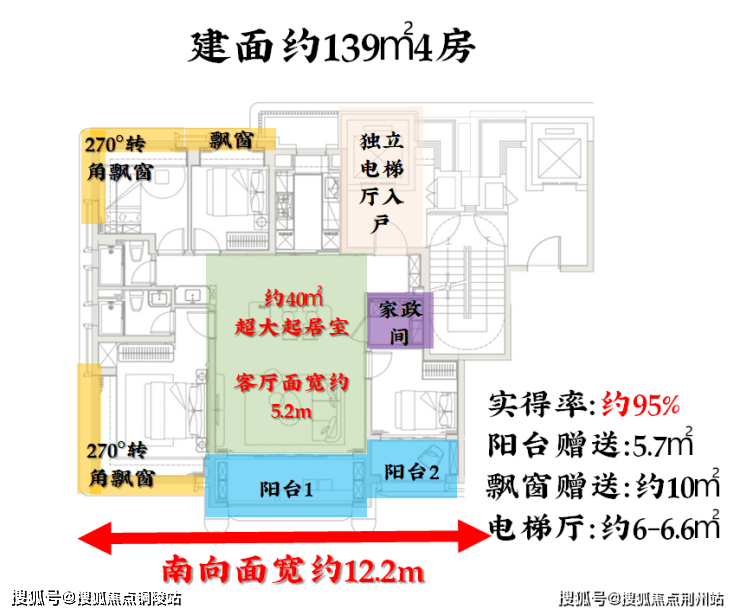 全赠飘窗 + 南向双阳台 + 独立全明电梯厅,0 过道浪费,空间利用率拉满;