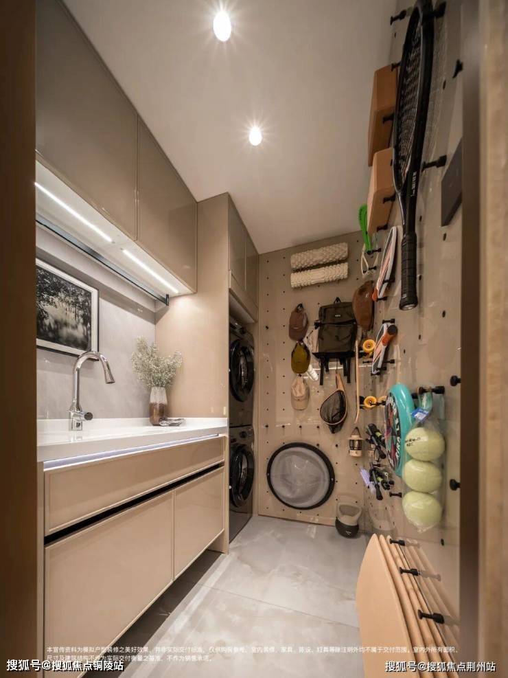 要知道,这种配置,通常只出现在160㎡+的顶豪里。这个独立家政间,把洗烘机、收纳、洗衣台等功能全部收纳,彻底释放了两个南阳台的景观价值;