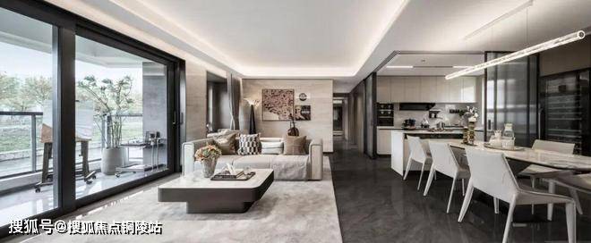 餐客厅弧形吊顶,柔和空间的边界,更带来视觉的延伸,增强空间的通透感,让空间更显明朗。与主卧配置的智慧灯光系统联动,让光线营造不同场景下的居家氛围感。