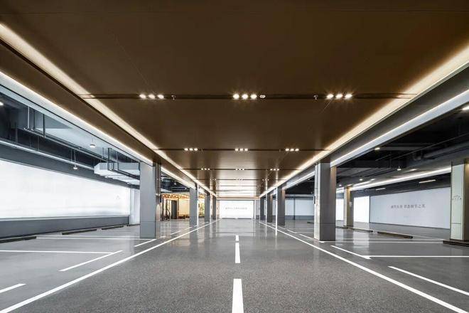 甚至业内“卷”到极致的地下精装车库,目前也同样实景呈现,冰火板+岩板打造的车行道廊柱、仿透光云石定制车牌号、部分主干道全铝板吊顶。
