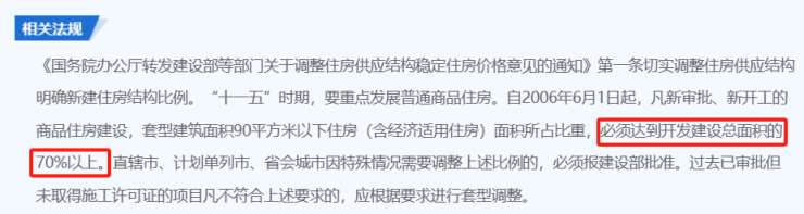 「自2006年6月1日起,凡新审批、新开工的商品住房建设,套型建筑面积90平方米以下住房面积所占比重,必须达到开发建设总面积的70%以上。」