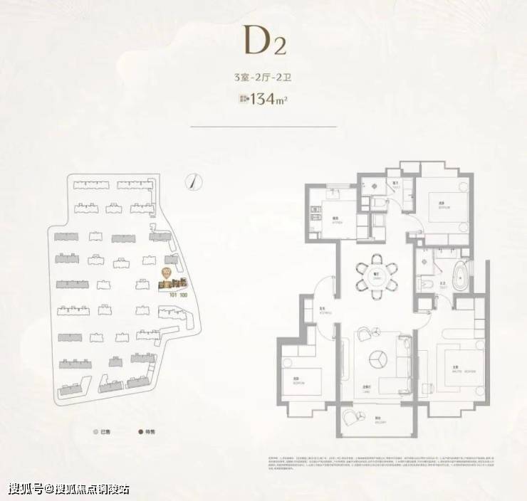 建面约134㎡3房,几乎可以看做是双套房的设计,尤其是主卧带浴缸和双台盆,保证了各个家庭成员的私密空间,适合一家三口的改善之选。
