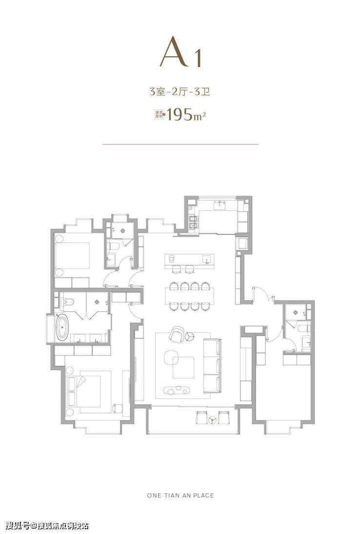 建面约195㎡3房是前期大卖的爆款户型,三套房设计,超大主卧空间,南北通透超大客餐厅,中西厨分开.这个户型让几乎家庭每个成员都能有很大的独处空间的同时又能有很多的家庭互动氛围。