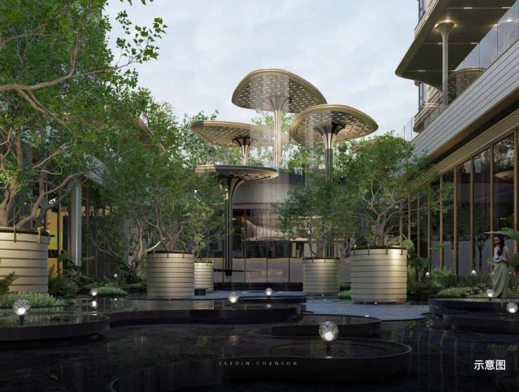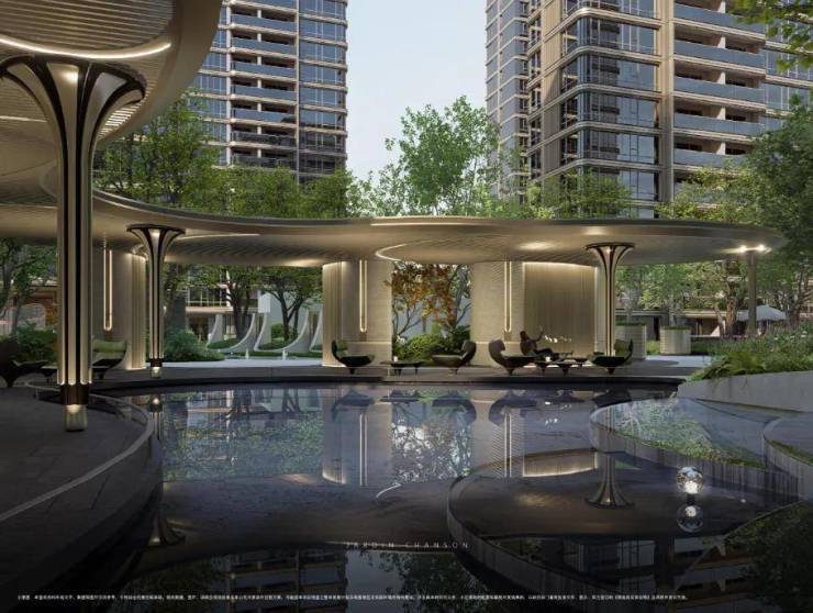 林岛漫步围绕中央景观,以现代艺术手法,打造森林岛屿景观循水归岸呼应外部天然水系,内部设置特色水景,串联不同节点闲庭雅致以树木、水系与局部连廊体系融合,共同组建起社区与居所之间的联通介质。