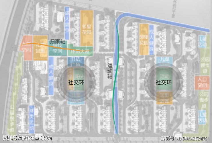运动轴-中央康养跑道,200米南北景观中轴,形成社区活力之源;社交环-社区中央会客厅,邻里花园、阳光草坪、儿童活动区、书法广场,聚合社交共融生活环;三组团-邻里花园+成人健身双组团,球类运动竞技组团。