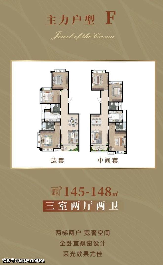 172㎡3房2厅3卫:横厅设计,7米宽幕阳台,270° 转角飘窗,双主卧套房 + 独立家政间,终极改善天花板,仅18套。