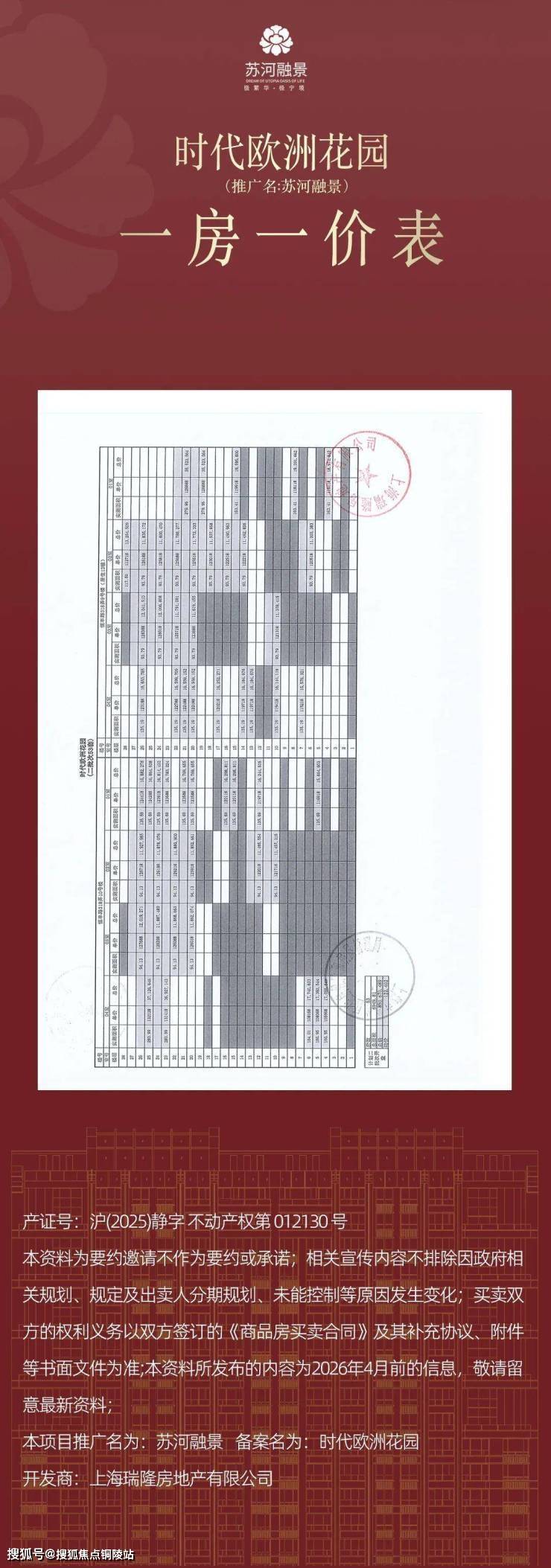 项目备案名 / 别名:备案名时代欧洲花园,推广名苏河融景,别名静安苏河湾现房、汉中路地铁房项目地址:上海市静安区恒丰路 318 弄(恒丰路与长安路交汇处)开盘时间:2025 年 11 月 30 日首期开盘,2026 年 4 月 15 日二批次加推交付时间:现房,2016-2017 年已整体交付,即买即住即办产证物业费:上海豪仁物业管理有限公司,5.1 元 /㎡/ 月楼层总高 / 产品:7 栋 11-30 层高层住宅,总户数 576 户;容积率 3.42,绿化率 35.1%,车位配比 1:0.7,70 年住宅产权