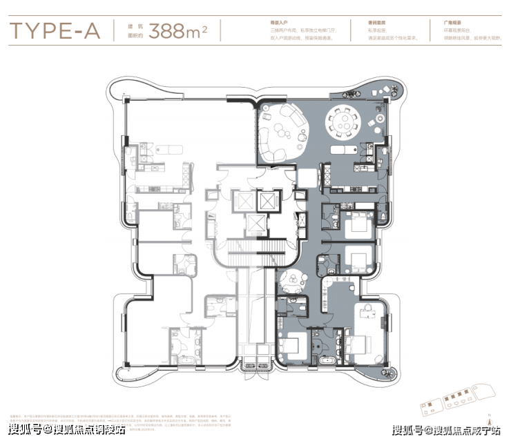 首先,三梯两户布局,私享独立电梯门厅;双入户洄游动线,预留保姆通道,顶豪该有的尊崇感被诠释得淋漓尽致。