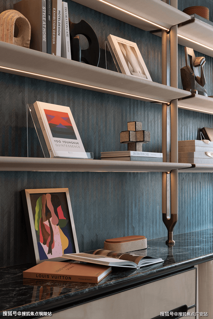 集收藏、私享于一体的书房区,摒弃冗杂的装饰,展示架墙面与特殊木纹墙纸拼接,勾勒出立体层次。同时利用柜体增设折叠床,以灵活实现展开或折叠之态,打造成多功能灵动空间。