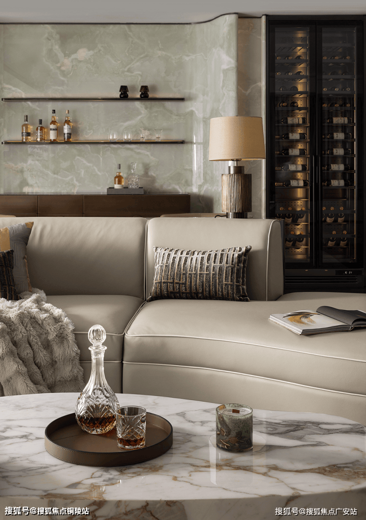 约270°的环幕视野,让阳光肆意倾洒,观景效果极佳。光影勾勒形体,色彩渲染风格,以打造能量社交场。视觉的温暖和青玉石带来的温润质地,在淡雅柔软的饰面映衬下,散发着慵懒惬意之感。