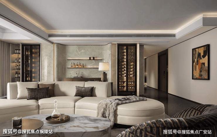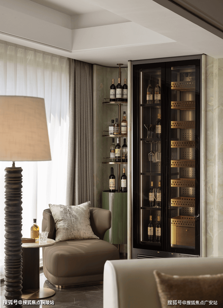 弧形沙发后的一组休闲椅,旨在实现生活方式及场景需求的变换组合。既是茶台,亦可是开放的亲子空间。同时有效利用墙体和飘窗,定制丰富的藏酒区,以美学介入未来生活,透露居者品味之余,让这一隅也拥有着无限延展性。