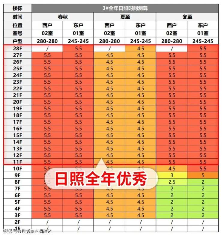 小胖建筑师对3号楼全年日照做了测评,11楼以上几乎全年优秀日照,这在楼栋密集的上海内环内非常少见。