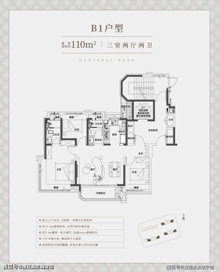 先来看建面约110㎡边套大横厅户型:约12.3米的超宽绰面宽几乎是堪比别墅产品了,这个视野和 南向采光面相当出众。