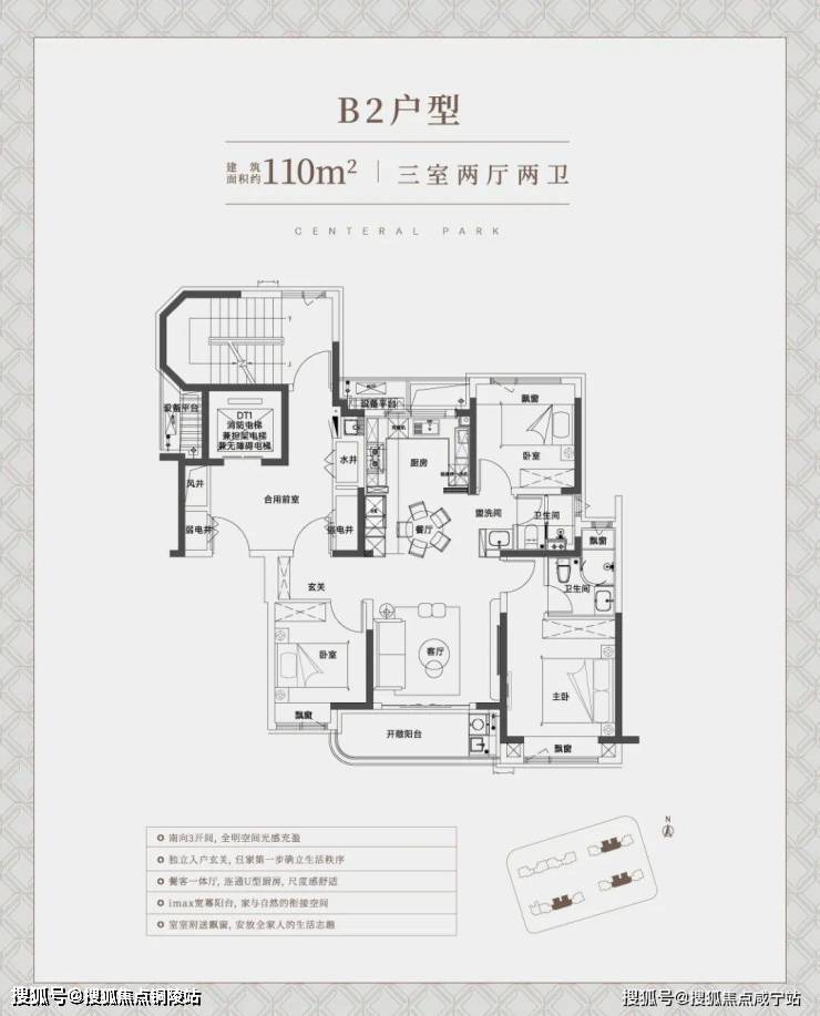 再来看建面约110㎡中间套竖厅户型:
