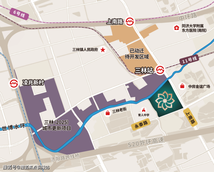 项目坐落于浦东三林板块,隶属上海“十四五”规划中的金色中环发展带,与前滩仅隔一条中环路,地铁11号线三林站直线距离约200米,步行可达,1站直达前滩核心,2站抵达徐汇滨江,轨交通勤优势显著。