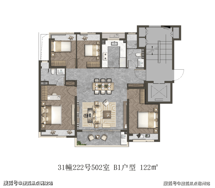 四房两厅两卫的布局,能做到两个房间朝南,主卧和南次卧的空间都很宽敞。