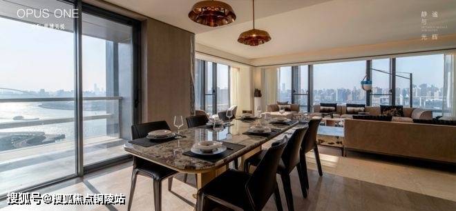 这客厅既是270°全景舱厅,无论全家在餐桌前欢聚一堂,还是孩子们在客厅嬉戏,一抬头便是以江景和城市为主题的巨幅油画。