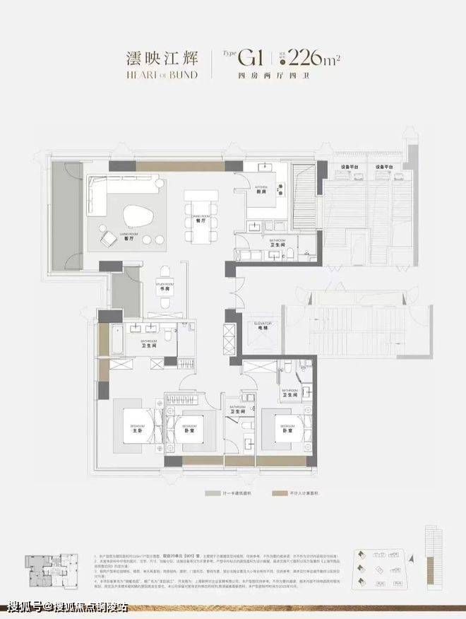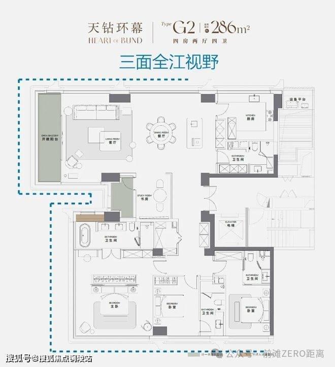 510㎡户型空间秉承“世界级一户一定制”理念,四个卧室均为全套房设计,主卧总统套可实现三面看江。