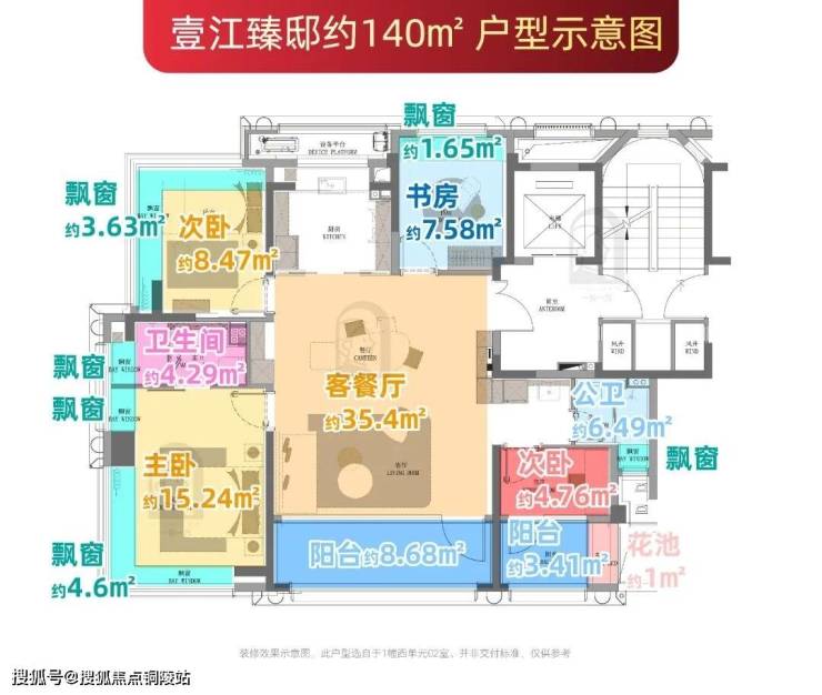 建面约140㎡户型则通过6个飘窗(含2个270°转角飘窗)、2个南向阳台(赠送一半面积)及独享约6.8㎡电梯厅,赠送面积高达约27.2㎡。