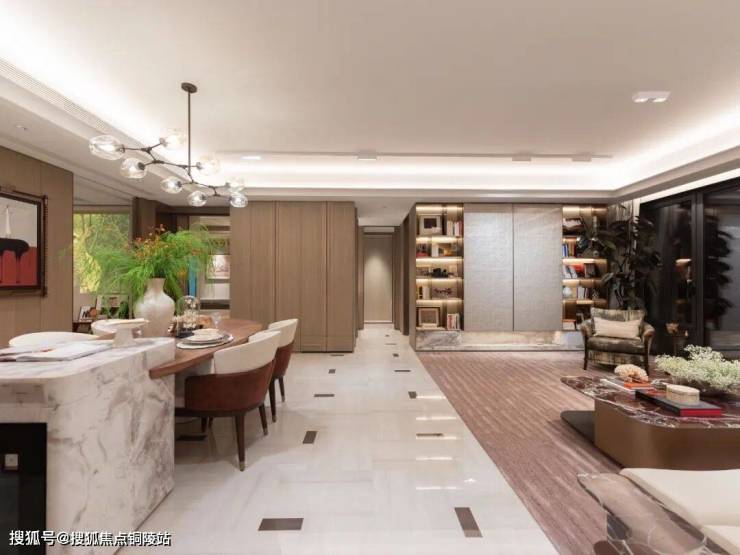 归家八角厅:以法式为底蕴,地面与墙面精选贝金米黄大理石与卡拉白大理石铺陈,纹理如山水画般自然流动。