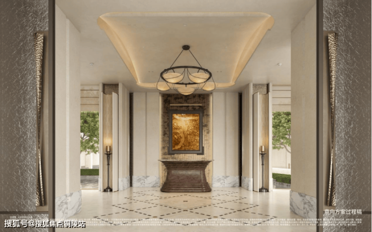 入口处悬挂量身定制的装置作品,以现代语言呼应新经典主义美学,从第一印象奠定社区艺境格调。