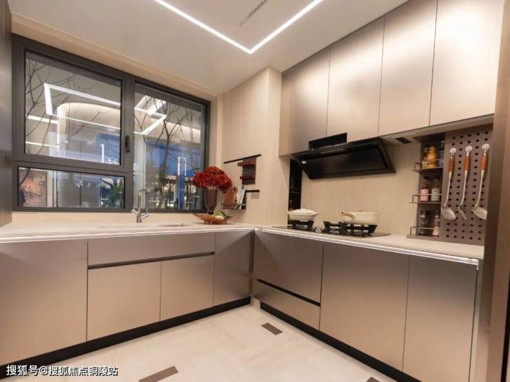 项目对厨房的考量贯穿每一处细节:采用高效的U型布局,洗、切、炒动线一气呵成。