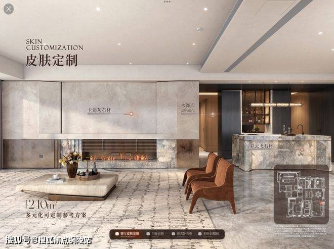 比如皮肤定制,墙面、地面、全屋柜门均提供多材质、多配色可选,客厅背景墙、岛台亦有多种石材方案自由搭配;