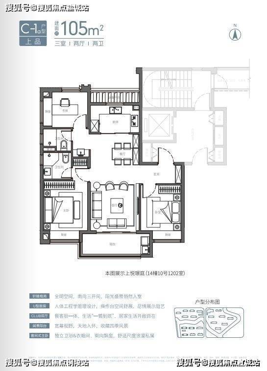 U型厨房、餐厅、客厅、阳台一线联通,南北通透。主卧套房、全卧飘窗、次卫干湿分离也都是标配。